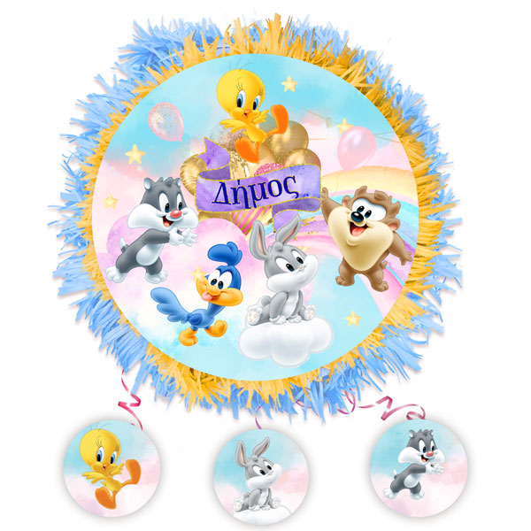 • Από την πινιάτα κρέμονται 3 στρογγυλά διακοσμητικά από χαρτόνι με τύπωμα στο θέμα της πινιάτας