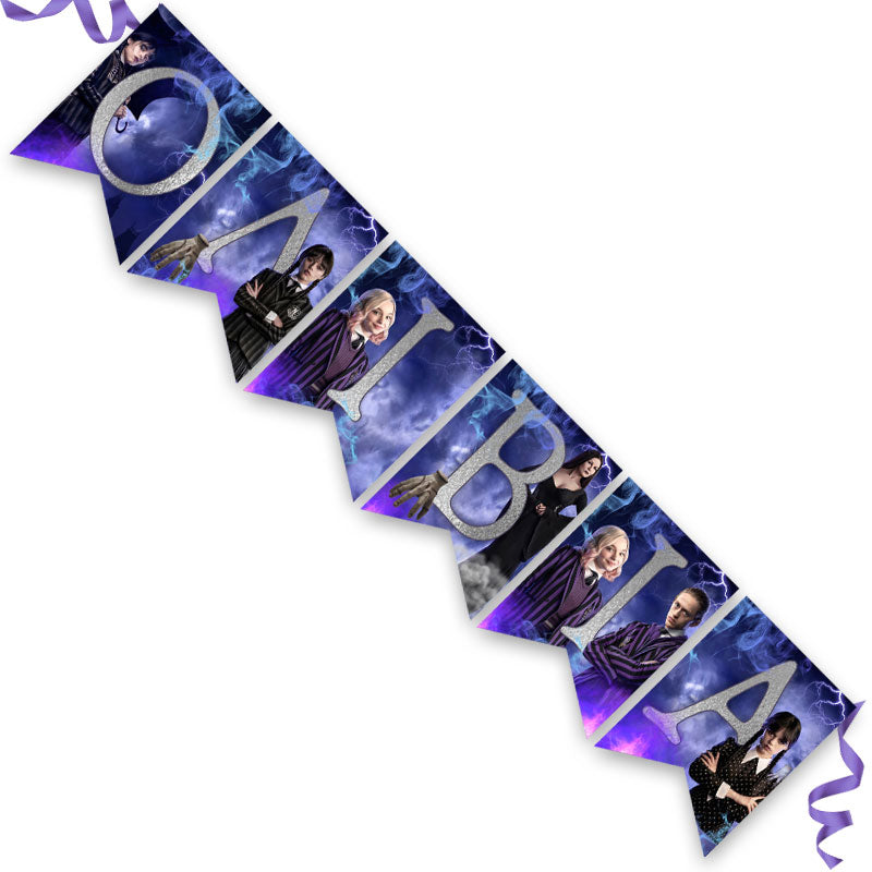 Σημαιάκια με όνομα και θέμα την Wednesday Addams για να διακοσμήσετε τον χώρο του πάρτυ σας και να βάλετε όλους τους καλεσμένους στην πιο dark γιορτινή διάθεση!