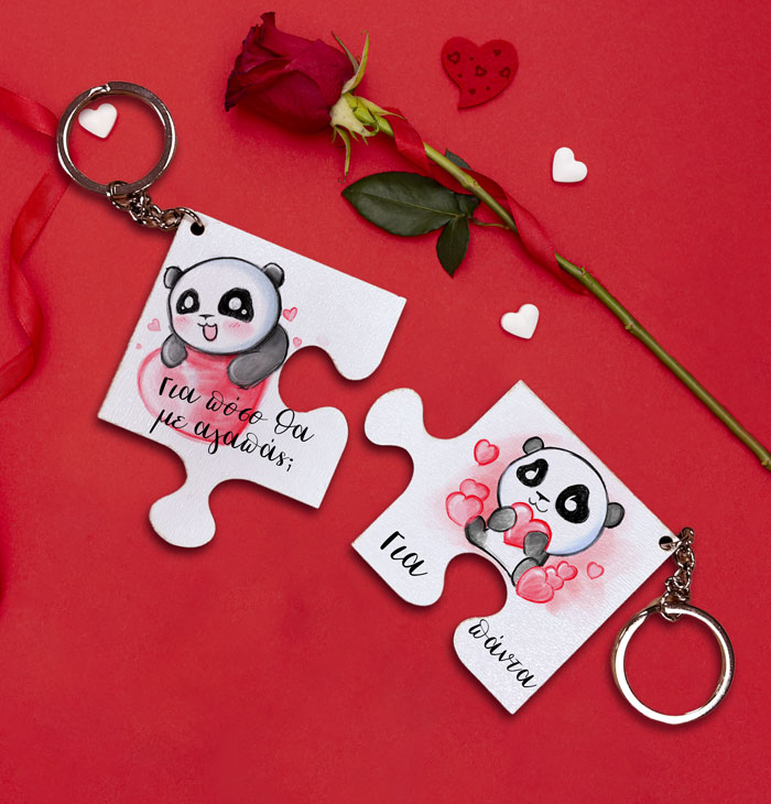 Σετ ξύλινα μπρελόκ για τα κλειδιά σε σχήμα παζλ με χαριτωμένα αρκουδάκια Πάντα. Ένα έξυπνο δωράκι για ζευγάρια!
