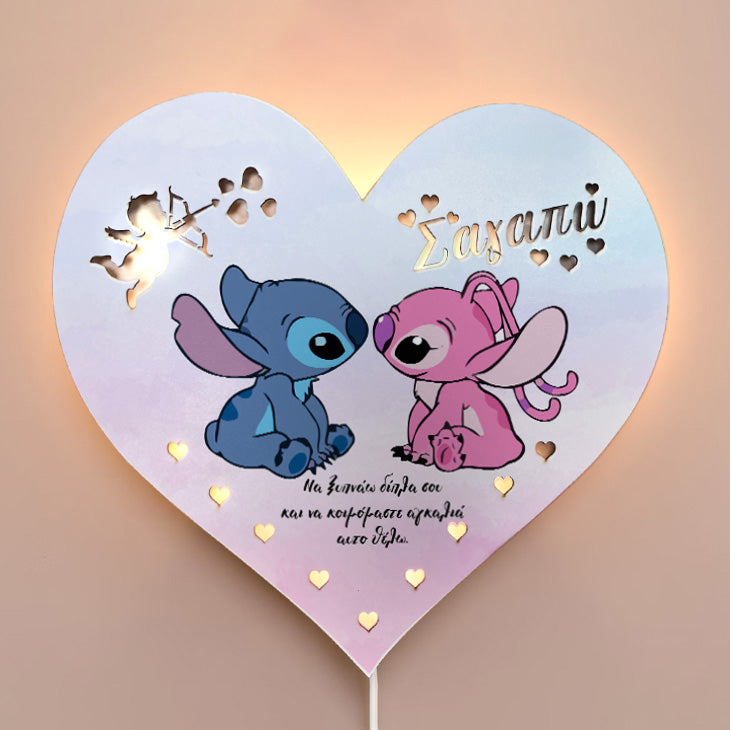 Εντυπωσιακό ξύλινο φωτιστικό αγάπης σε σχήμα καρδιάς και σχέδια τα τερατάκια Λίλο & Στιτς! Ένα μοναδικό δώρο για να χαρίσεις στο αγαπημένο σου πρόσωπο, που θα διακοσμεί το δωμάτιο και θα σε θυμίζει!