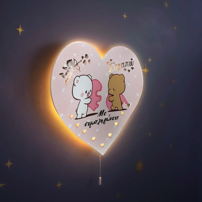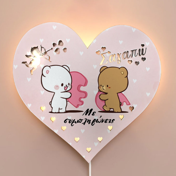 Εντυπωσιακό ξύλινο φωτιστικό αγάπης σε σχήμα καρδιάς και σχέδιο ¨Με συμπληρώνεις" με τα χαριτωμένα αρκουδάκια! Ένα μοναδικό δώρο για να χαρίσεις στο αγαπημένο σου πρόσωπο, που θα διακοσμεί το δωμάτιο και θα σε θυμίζει!