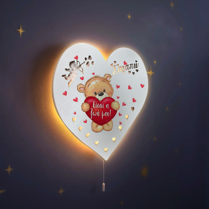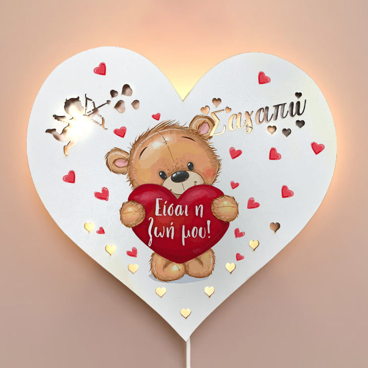 Εντυπωσιακό ξύλινο φωτιστικό αγάπης σε σχήμα καρδιάς και με σχέδιο αρκουδάκι αγάπης! Ένα μοναδικό δώρο για να χαρίσεις στο αγαπημένο σου πρόσωπο, που θα διακοσμεί το δωμάτιο και θα σε θυμίζει!