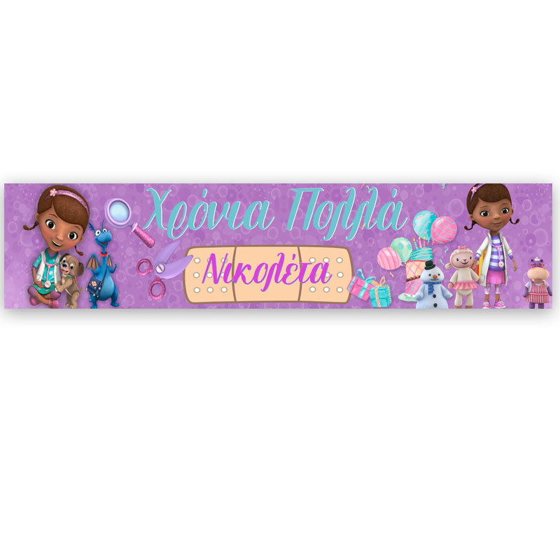 Banner πάρτυ με θέμα την μικρή Γιατρό και τυπωμένο το όνομα της επιλογής σου! Μπορεί να χρησιμοποιηθεί ως runner για τη διακόσμηση του τραπεζιού ή ως banner στην πόρτα ή τον τοίχο.