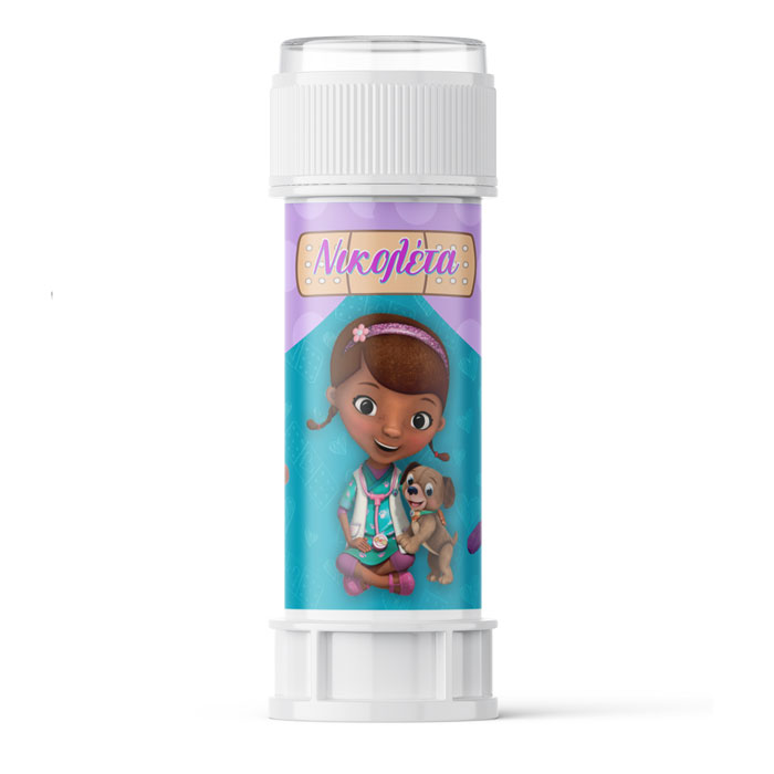 Προσωποποιημένες σαπουνόφουσκες Η μικρή Γιατρός με χάρτινο περιτύλιγμα, για να χαρίσεις ως δωράκι στoυς μικρούς καλεσμένους του πάρτυ.