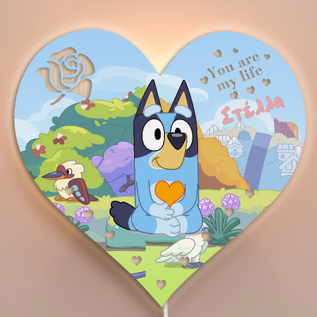 Εντυπωσιακό προσωποποιημένο ξύλινο φωτιστικό σε σχήμα καρδιάς με τη Bluey! Ένα μοναδικό δώρο για να χαρίσεις στο αγαπημένο σου πρόσωπο για να διακοσμεί το δωμάτιο!