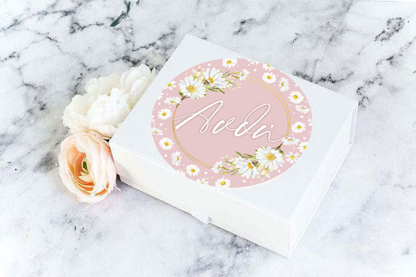 Στρογγυλά προσωποποιημένα αυτοκόλλητα με θέμα Μαργαρίτα. Μπορείτε να τα χρησιμοποιήσετε σε κουτάκια μπομπονιέρας, σε μπουκάλια και ποτήρια ή σε οποιοδήποτε άλλο αντικείμενο θέλετε να διακοσμήσετε για τη βάπτιση ή το πάρτυ.