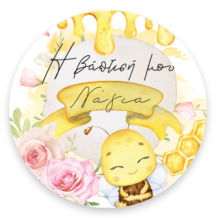 Στρογγυλή αφίσα με θέμα Μέλισσα και εκτυπωμένο το μήνυμα που θέλεις, για να διακοσμήσεις το χώρο της βάπτισης του μωρού σου!