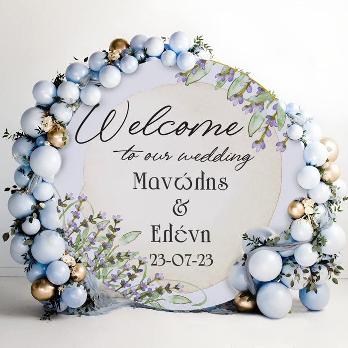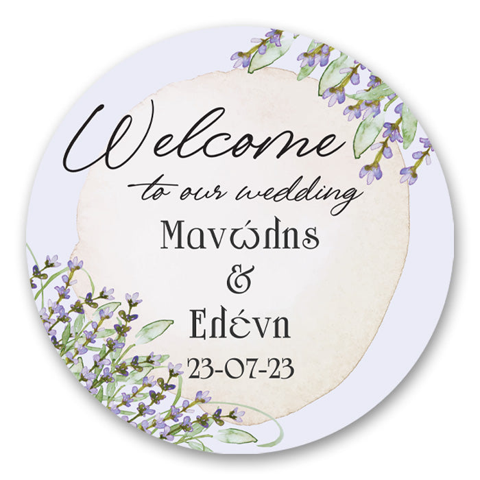 Στρογγυλή αφίσα γάμου με θέμα την λεβάντα. Η λεβάντα που συμβολίζει την ηρεμία και την γαλήνη θα αποτελέσει ιδανικό θέμα για να δημιουργήσεις την πιο φρέσκια και ξεχωριστή διακόσμηση για τον γάμο σου.