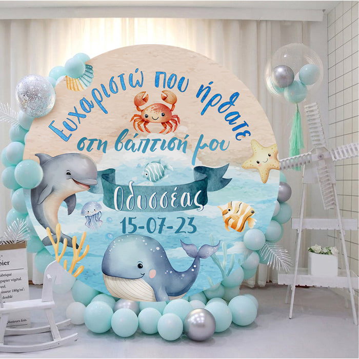 Στρογγυλή αφίσα με θέμα Θάλασσα και εκτυπωμένο το μήνυμα που θέλετε, για να διακοσμήσετε το χώρο της βάπτισης του μωρού σας!