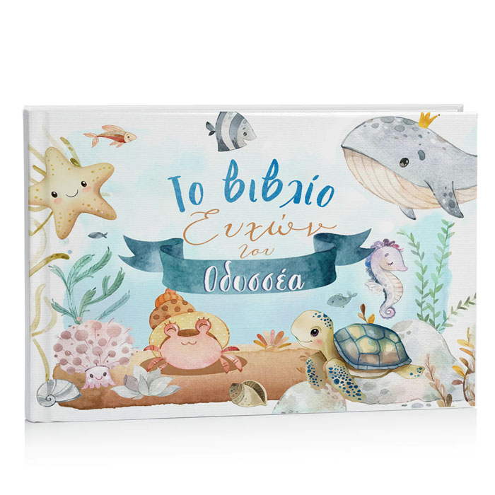Εντυπωσιακό ευχολόγιο για τη βάπτιση του μωρού σας με θέμα τα ζωάκια της Θάλασσας! Κρατήστε για πάντα τις ευχές των καλεσμένων σας ως ενθύμιο σε ένα όμορφο προσωποποιημένο βιβλίο.