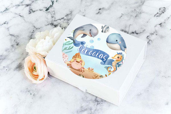Στρογγυλά προσωποποιημένα αυτοκόλλητα με θέμα Θάλασσα. Μπορείτε να τα χρησιμοποιήσετε σε κουτάκια μπομπονιέρας, σε μπουκάλια και ποτήρια ή σε οποιοδήποτε άλλο αντικείμενο θέλετε να διακοσμήσετε για τη βάπτιση ή το πάρτυ.