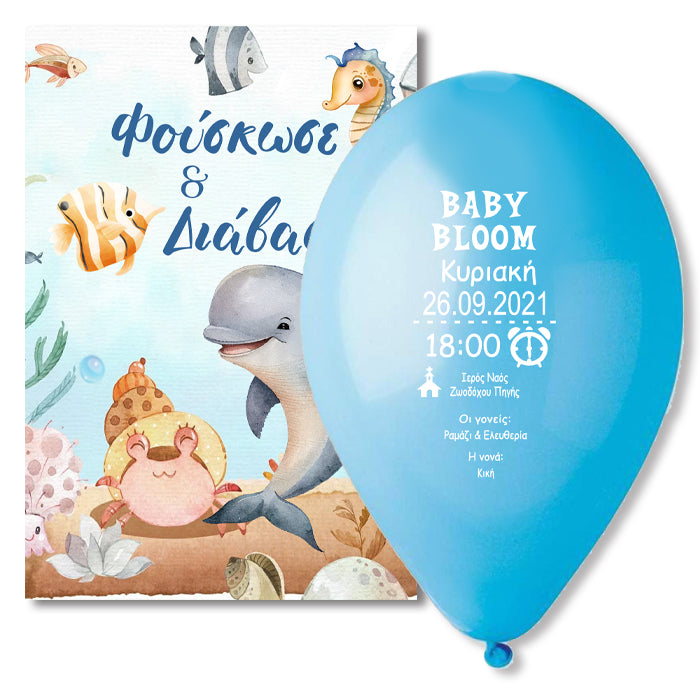 Πρωτότυπο προσκλητήριο βάπτισης σε τυπωμένο μπαλόνι με θέμα Θάλασσα. Οι καλεσμένοι θα πρέπει να φουσκώσουν το τυπωμένο μπαλόνι για να μάθουν τις λεπτομέρειες της βάπτισης!