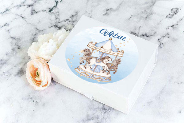 Στρογγυλά προσωποποιημένα αυτοκόλλητα με θέμα Καρουζέλ. Μπορείτε να τα χρησιμοποιήσετε σε κουτάκια μπομπονιέρας, σε μπουκάλια και ποτήρια ή σε οποιοδήποτε άλλο αντικείμενο θέλετε να διακοσμήσετε για τη βάπτιση ή το πάρτυ.