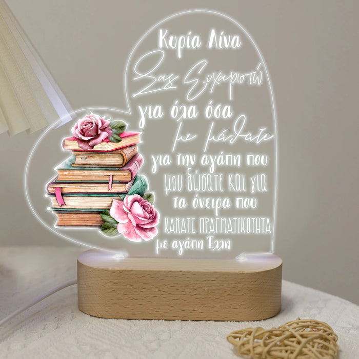 Προσωποποιημένο φωτιστικό σε σχήμα καρδιάς και με γλυκό μήνυμα! Ένα πρωτότυπο δώρο για να χαρίσεις στην αγαπημένη σου δασκάλα. Θα διακοσμεί το δωμάτιο και θα σε θυμίζει!