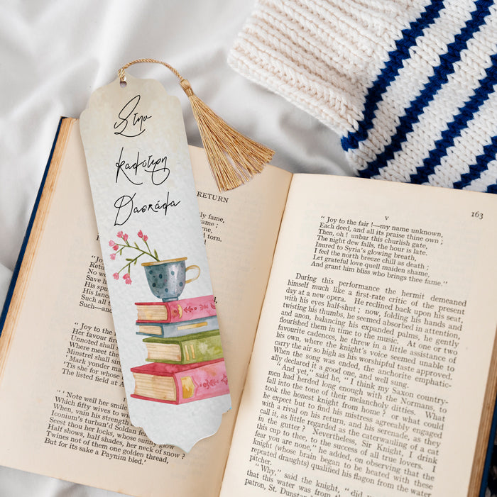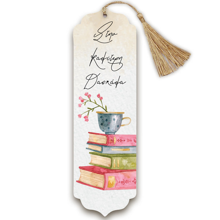 Ο σελιδεδείκτης είναι από ξύλο, διακοσμημένος με φούντα και έχει χαραγμένο μήνυμα.