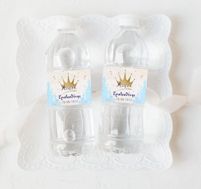 Οι μικροί καλεσμένοι δεν γίνεται να έχουν ένα κοινό μπουκάλι νερού! Μεταμορφώστε τα με τις ετικέτες για μπουκάλια νερού με θέμα Κορώνα αγόρι, που μπορούν να αναγράφουν το όνομα του παιδιού σας.