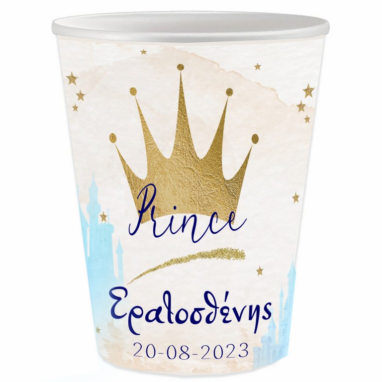 Ποτηράκια με το όνομα της επιλογής σας και θέμα την Κορώνα για αγόρι, για να κεράσετε τους καλεσμένους σας στο τραπέζι του πάρτυ ή της βάπτισης!