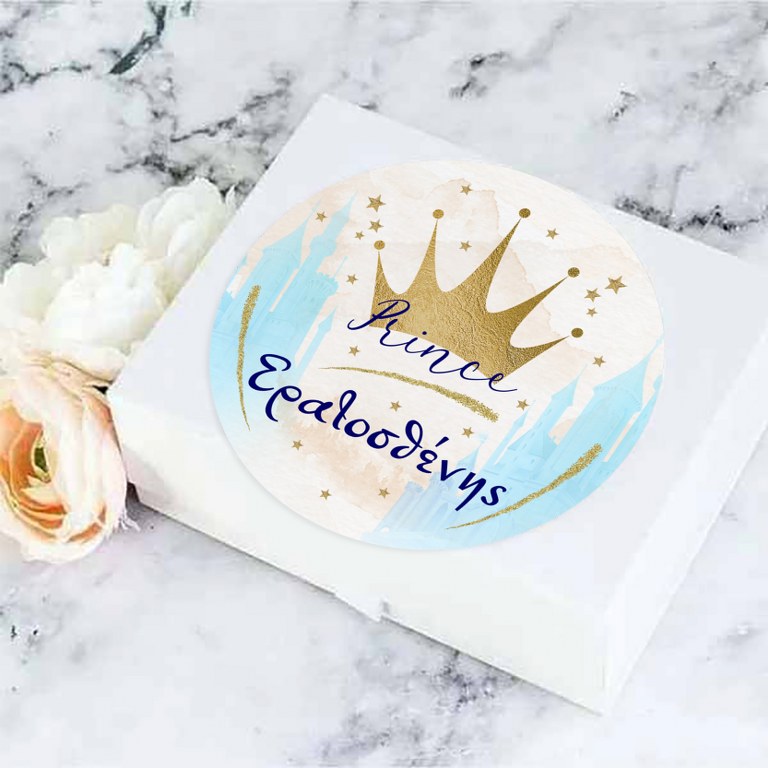 Στρογγυλά προσωποποιημένα αυτοκόλλητα με θέμα Κορώνα για αγόρι. Μπορείτε να τα χρησιμοποιήσετε σε κουτάκια μπομπονιέρας, σε μπουκάλια και ποτήρια ή σε οποιοδήποτε άλλο αντικείμενο θέλετε να διακοσμήσετε για τη βάπτιση ή το πάρτυ.