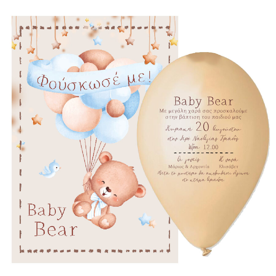 Πρωτότυπο προσκλητήριο βάπτισης σε τυπωμένο μπαλόνι με θέμα Αρκουδάκι. Οι καλεσμένοι θα πρέπει να φουσκώσουν το τυπωμένο μπαλόνι για να μάθουν τις λεπτομέρειες της βάπτισης!