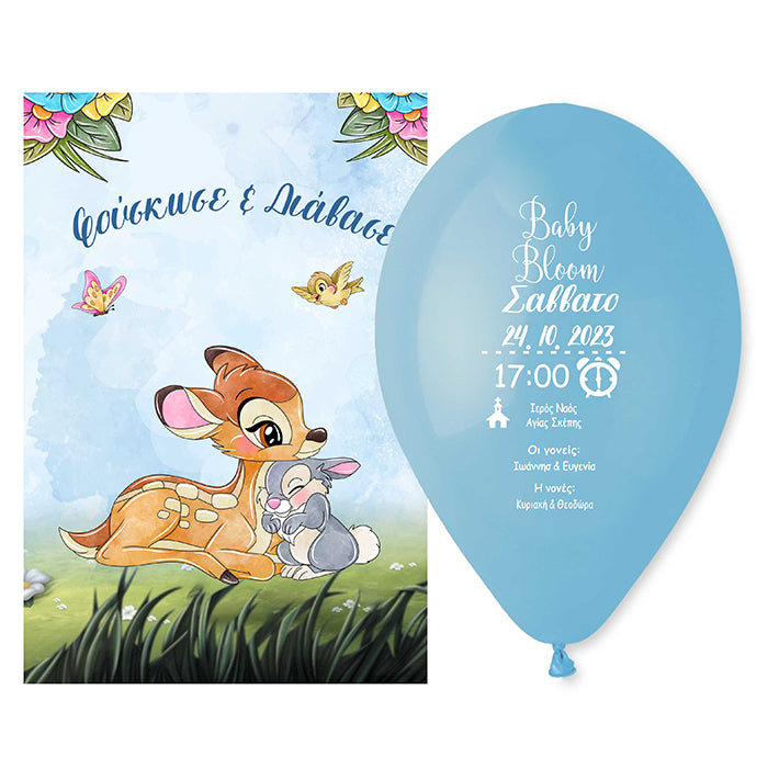 Πρωτότυπο προσκλητήριο βάπτισης σε τυπωμένο μπαλόνι με θέμα το Ελαφάκι Bambi. Οι καλεσμένοι θα πρέπει να φουσκώσουν το τυπωμένο μπαλόνι για να μάθουν τις λεπτομέρειες της βάπτισης!