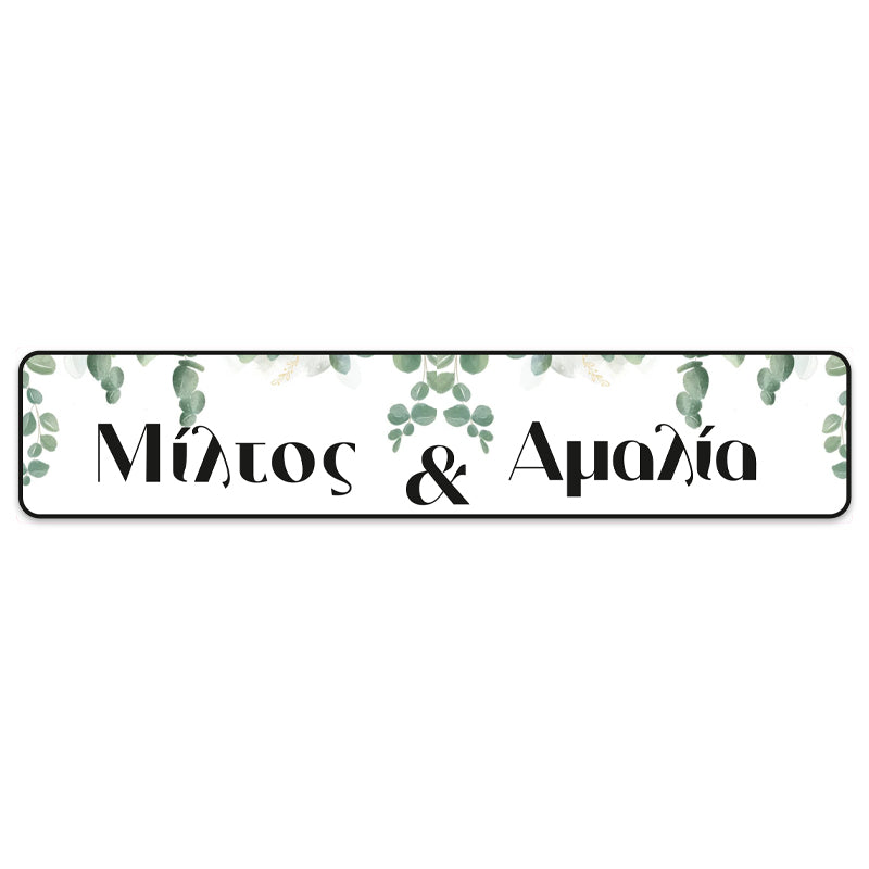 Πινακίδες αυτοκινήτου γάμου με τα ονόματα του ζευγαριού και σχέδιο φύλλα ευκάλυπτου. Μια πρωτότυπη ιδέα για να στολίσετε το αυτοκίνητο του ζευγαριού για το γάμο!