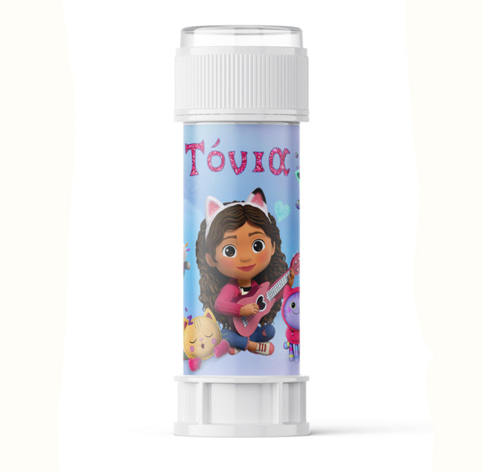 Προσωποποιημένες σαπουνόφουσκες με χάρτινο περιτύλιγμα και σχέδιο το Κουκλόσπιτο της Γκάμπι, για να χαρίσετε ως αναμνηστικό δωράκι στα παιδάκια του πάρτυ.