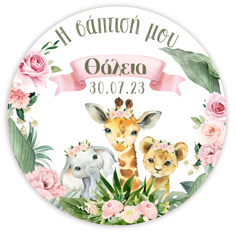 Στρογγυλή αφίσα με θέμα τα ζωάκια της ζούγκλας σε κοριτσίστικα χρώματα και εκτυπωμένο το μήνυμα που θέλετε, για να διακοσμήσετε το χώρο της βάπτισης της μικρής σας!