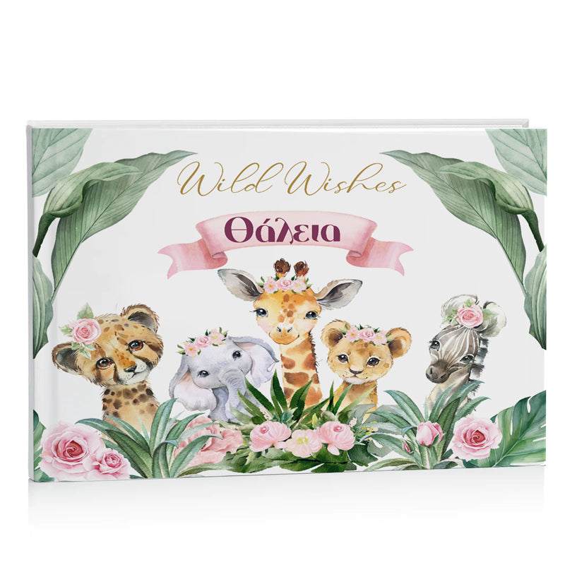 Εντυπωσιακό, χειροποίητο Βιβλίο Ευχών με θέμα τα Ζώα της Ζούγκλας σε κοριτσίστικα χρώματα, για τη Βάπτιση του μωρού σας! Κρατήστε για πάντα τις ευχές των καλεσμένων σας σε ένα όμορφο ευχολόγιο.