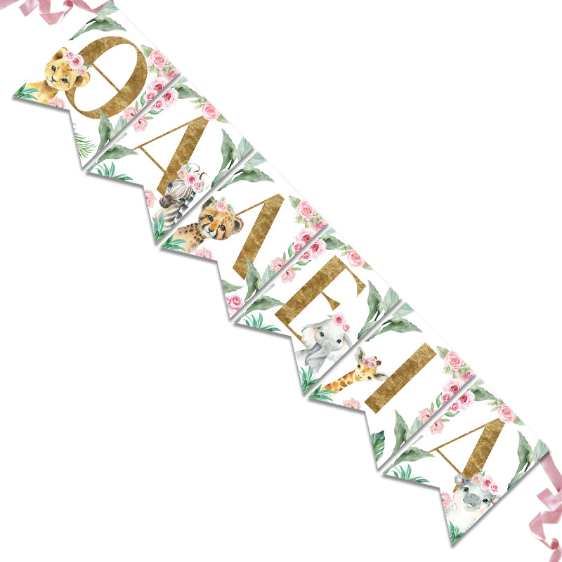 Διακοσμητικά σημαιάκια με το όνομα του μωρού σας και θέμα Ζώα της Ζούγκλας σε κοριτσίστικες αποχρώσεις για να στολίσετε τον χώρο της Βάπτισης!