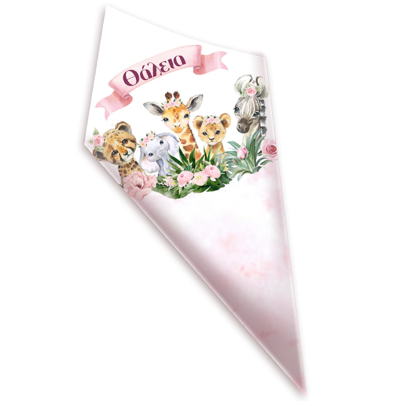 Στολίστε το candy bar ή το τραπέζι, με προσωποποιημένα χωνάκια ζαχαρωτών με θέμα Ζώα της Ζούγκλας σε κοριτσίστικες αποχρώσεις για να κεραστούν οι καλεσμένοι σας!