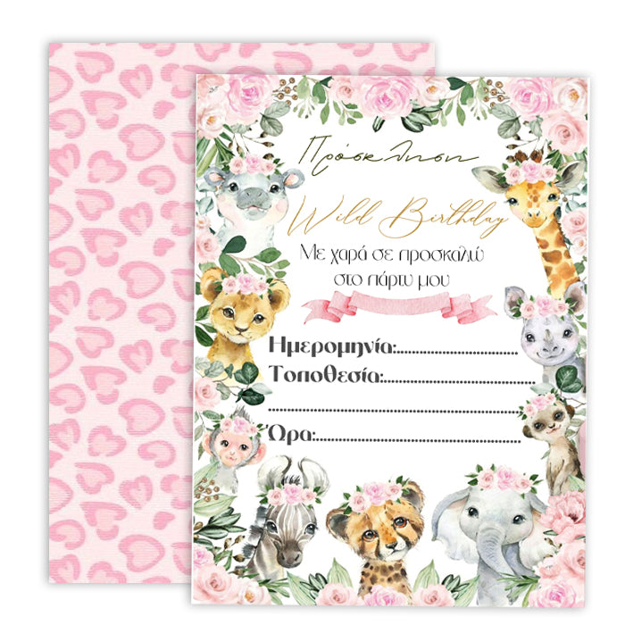 Προσκλήσεις για το πάρτυ γενεθλίων με θέμα τα ζωάκια της ζούγκλας σε κοριτσίστικους τόνους!