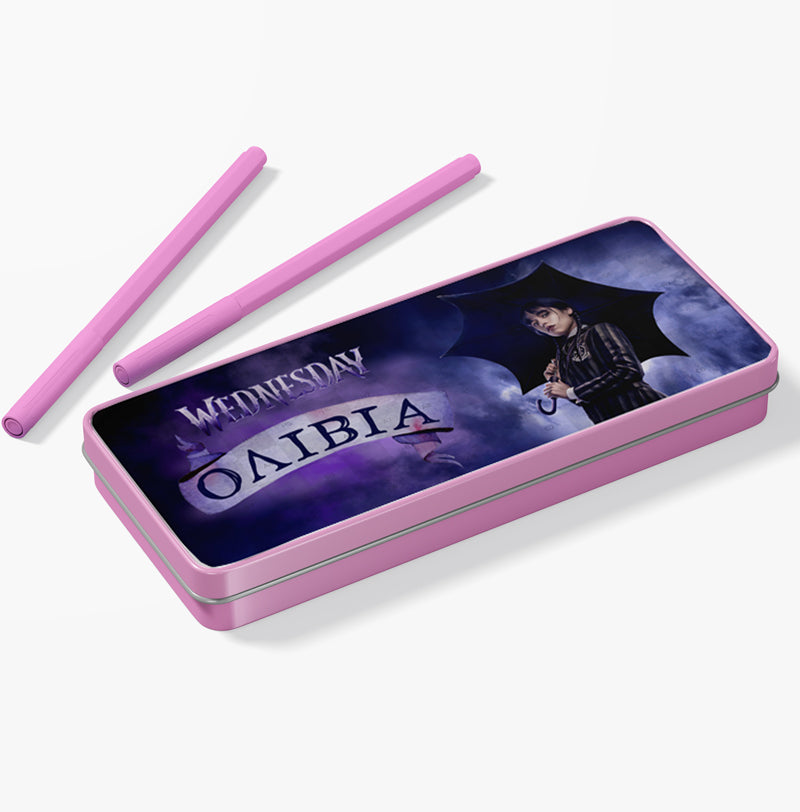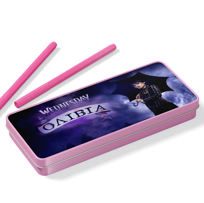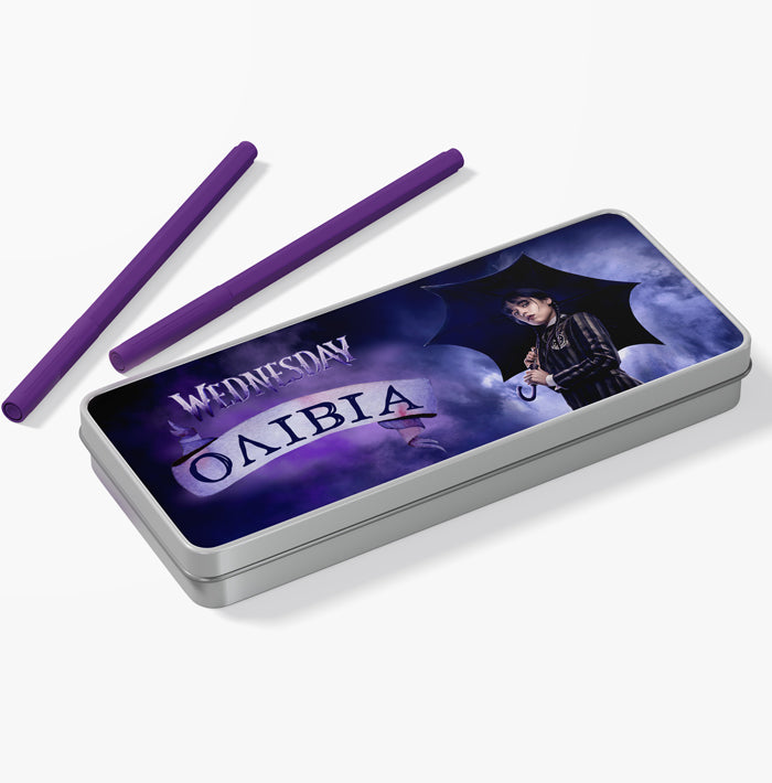 Μεταλλική κασετίνα με σχέδιο Wednesday και τυπωμένο το όνομα! Βάλε σ'αυτή τα αγαπημένα σου σχολικά αντικείμενα ή δώρισέ την σε μια φίλη σου και ξεχωρίστε στην τάξη!
