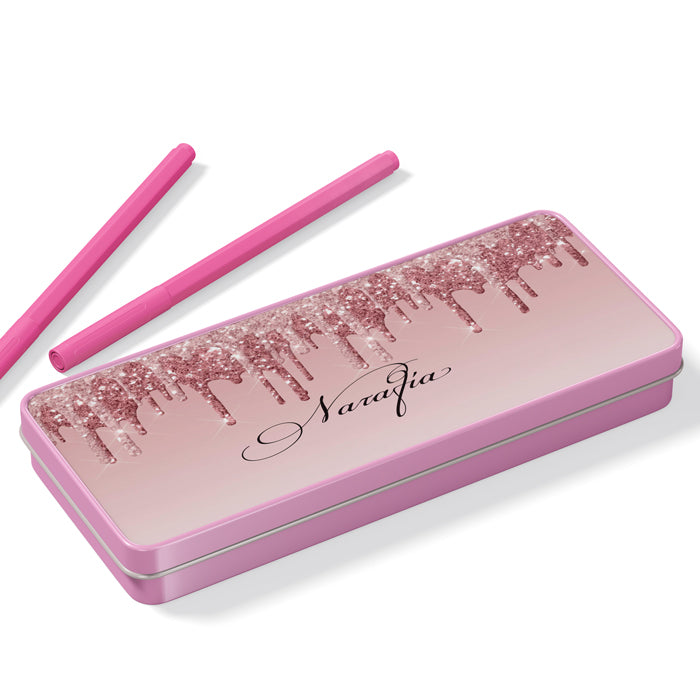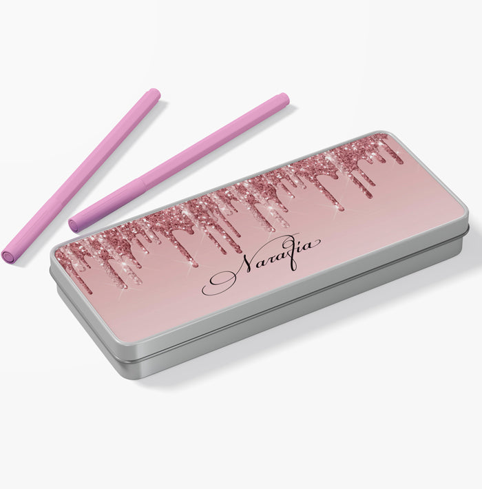 Μεταλλική κασετίνα με σχέδιο ροζ-χρυσό γκλίτερ και τυπωμένο το όνομα! Βάλε σ'αυτή τα αγαπημένα σου σχολικά αντικείμενα ή δώρισέ την σε μια φίλη σου και ξεχωρίστε στην τάξη!