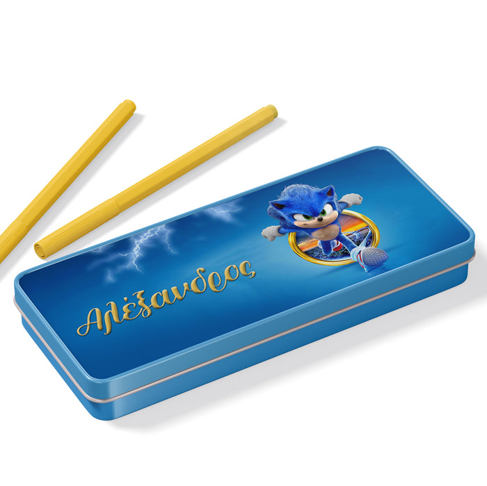 Μεταλλική γαλάζια κασετίνα με σχέδιο Sonic και τυπωμένο το όνομα! Βάλε σ'αυτή τα αγαπημένα σου σχολικά αντικείμενα ή δώρισέ την σε μια φίλη σου και ξεχωρίστε στην τάξη!