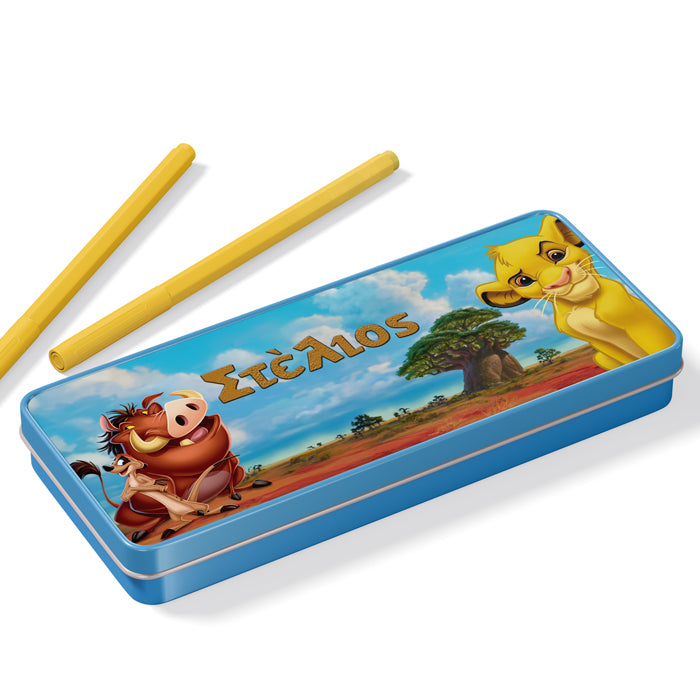 Μεταλλική γαλάζια κασετίνα με σχέδιο Lion King και τυπωμένο το όνομα! Βάλε σ'αυτή τα αγαπημένα σου σχολικά αντικείμενα ή δώρισέ την σε μια φίλη σου και ξεχωρίστε στην τάξη!