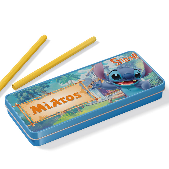 Μεταλλική γαλάζια κασετίνα με σχέδιο Stitch και τυπωμένο το όνομα! Βάλε σ'αυτή τα αγαπημένα σου σχολικά αντικείμενα ή δώρισέ την σε μια φίλη σου και ξεχωρίστε στην τάξη!