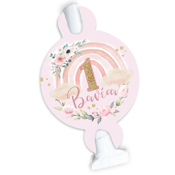 Προσωποποιημένα Blowouts με θέμα Ουράνιο Τόξο - Πρώτα γενέθλια, για να μοιράσεις στους καλεσμένους του πάρτυ και να τους βάλεις σε γιορτινή διάθεση!