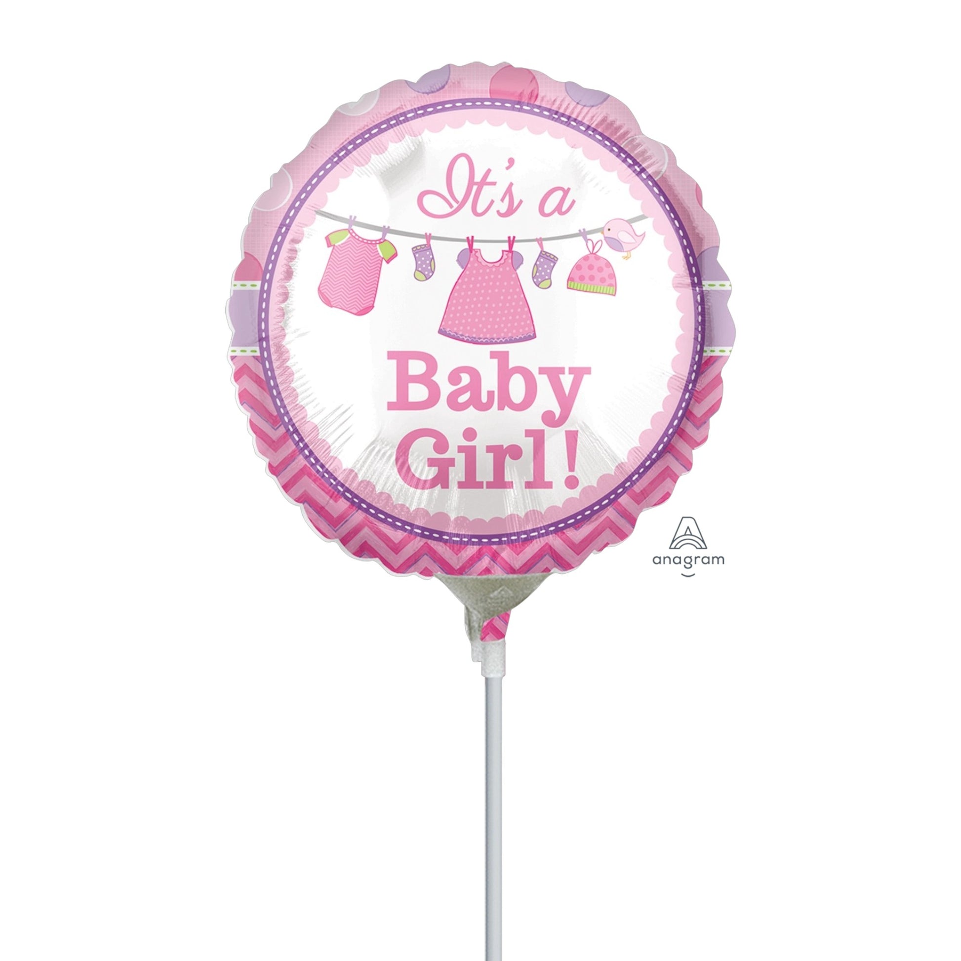 Γλυκό και παιχνιδιάρικο, αυτό το mini foil μπαλόνι απεικονίζει μια χαριτωμένη μπουγάδα με βρεφικά ρουχαλάκια και το μήνυμα "Baby Girl"