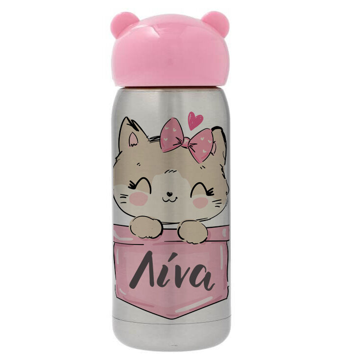 Προσωποποιημένο παγούρι με σχέδιο χαριτωμένο Γατάκι με φιογκάκι. Τα μικρά αυτάκια στο καπάκι που μοιάζουν με αρκουδάκι, δίνουν στο μπουκάλι μια παιχνιδιάρικη εμφάνιση. Το ιδανικό παγούρι με όνομα και σχέδιο, που θα κάνουν το παιδί σας να μην χάσει ξανά το παγούρι του!