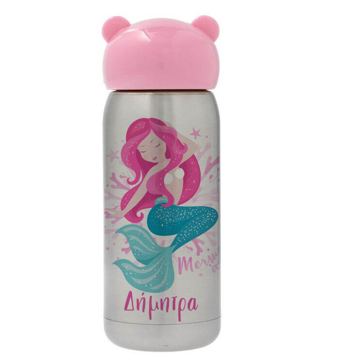Προσωποποιημένο παγούρι με σχέδιο όμορφη Γοργόνα. Τα μικρά αυτάκια στο καπάκι που μοιάζουν με αρκουδάκι, δίνουν στο μπουκάλι μια παιχνιδιάρικη εμφάνιση. Το ιδανικό παγούρι με όνομα και σχέδιο, που θα κάνουν το παιδί σας να μην χάσει ξανά το παγούρι του!