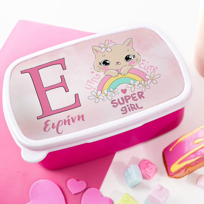 Παιδικό δοχείο φαγητού ουράνιο τόξο γατούλα με εκτυπωμένο όνομα της μικρής σας ώστε να το ξεχωρίζει στο σχολείο!