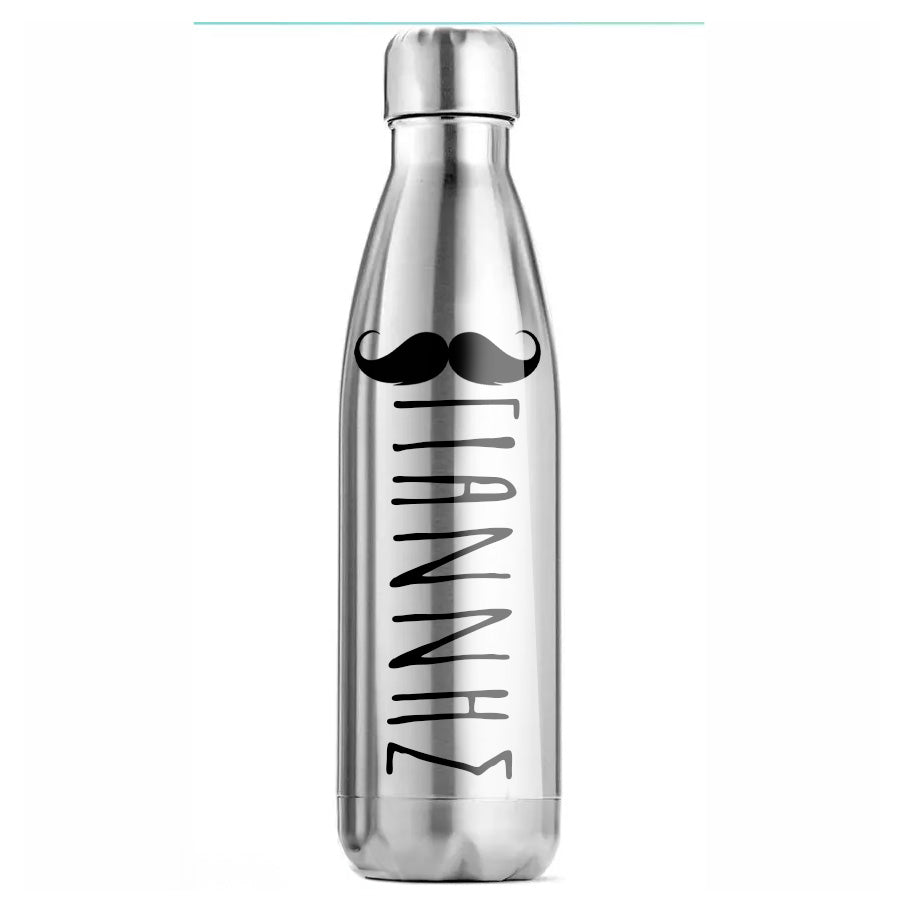Προσωποποιημένο ασημί μπουκάλι θερμός με σχέδιο μουστάκι για να χαρίσεις ένα πρωτότυπο δώρο! Κατασκευασμένο από ανθεκτικό ανοξείδωτο ατσάλι διπλού τοιχώματος που διατηρεί τη θερμοκρασία, αυτός ο θερμός είναι ιδανικός για το σχολείο και τις δραστηριότητες.