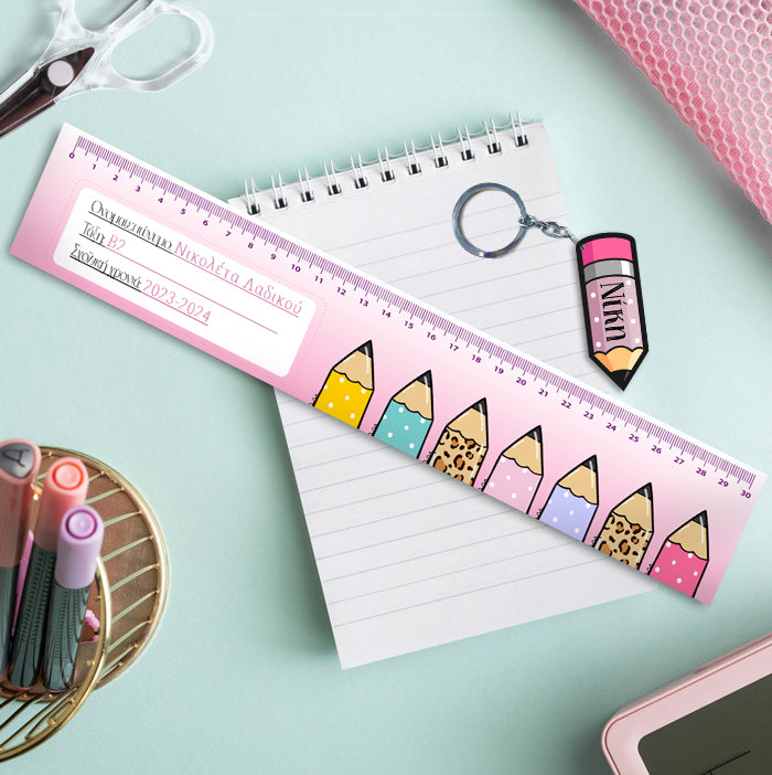 Προσωποποιημένος χάρακας στο σχέδιο μολύβια, με το όνομα και ασορτί μπρελόκ! To πιο τέλειο αξεσουάρ για το σχολείο ή το φροντιστήριο!