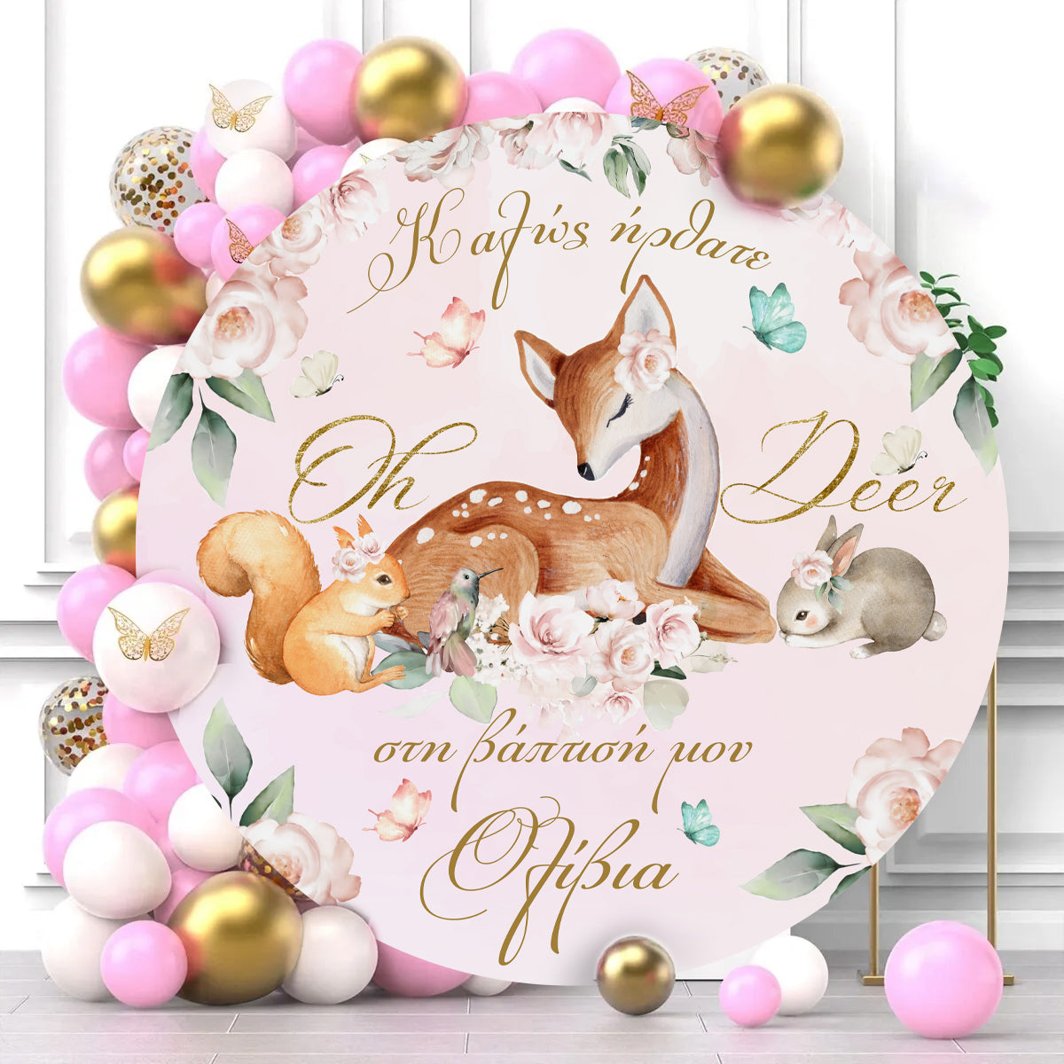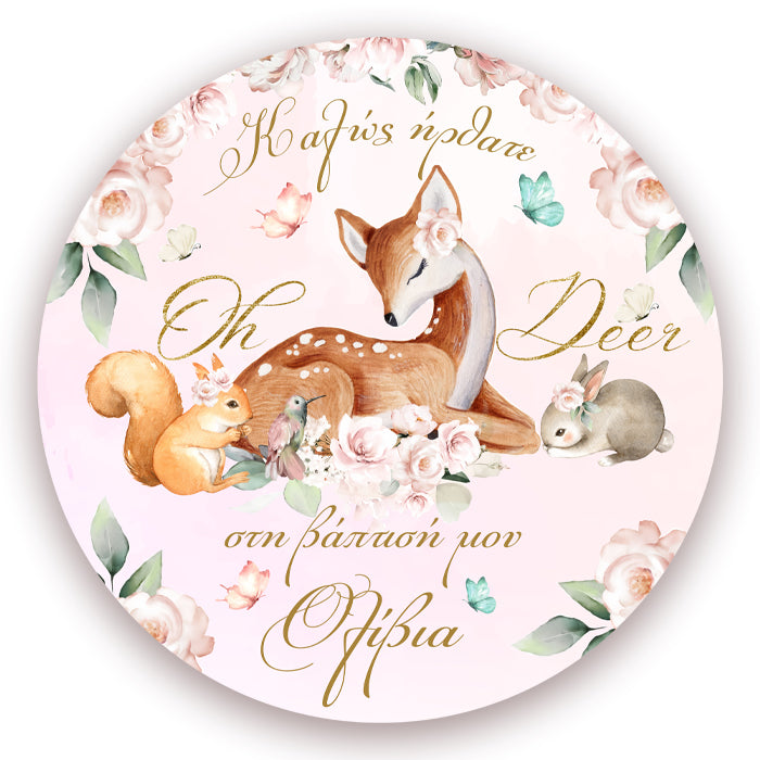 Στρογγυλή αφίσα με θέμα το ελαφάκι σε φλοράλ και εκτυπωμένο το μήνυμα που θέλετε, για να διακοσμήσετε το χώρο της βάπτισης της μικρής σας!
