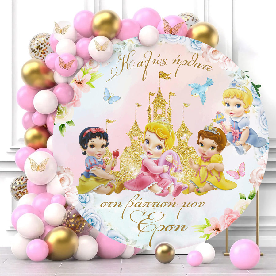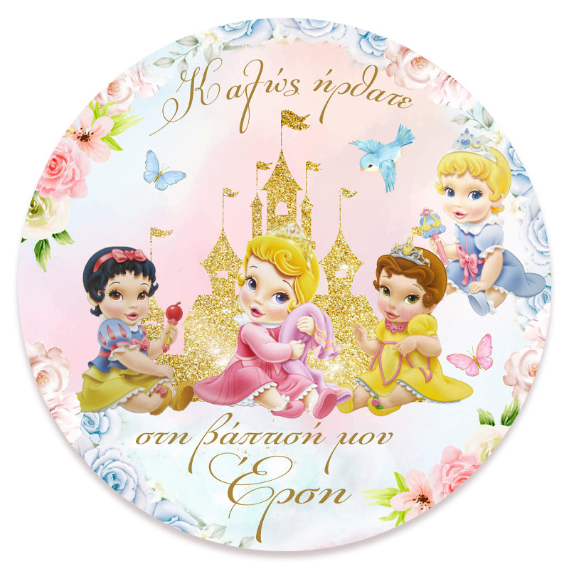 Στρογγυλή αφίσα με θέμα τις χαριτωμένες, μικρούλες Πριγκίπισσες Disney και εκτυπωμένο το μήνυμα που θέλετε, για να διακοσμήσετε το χώρο της βάπτισης της μικρής σας!