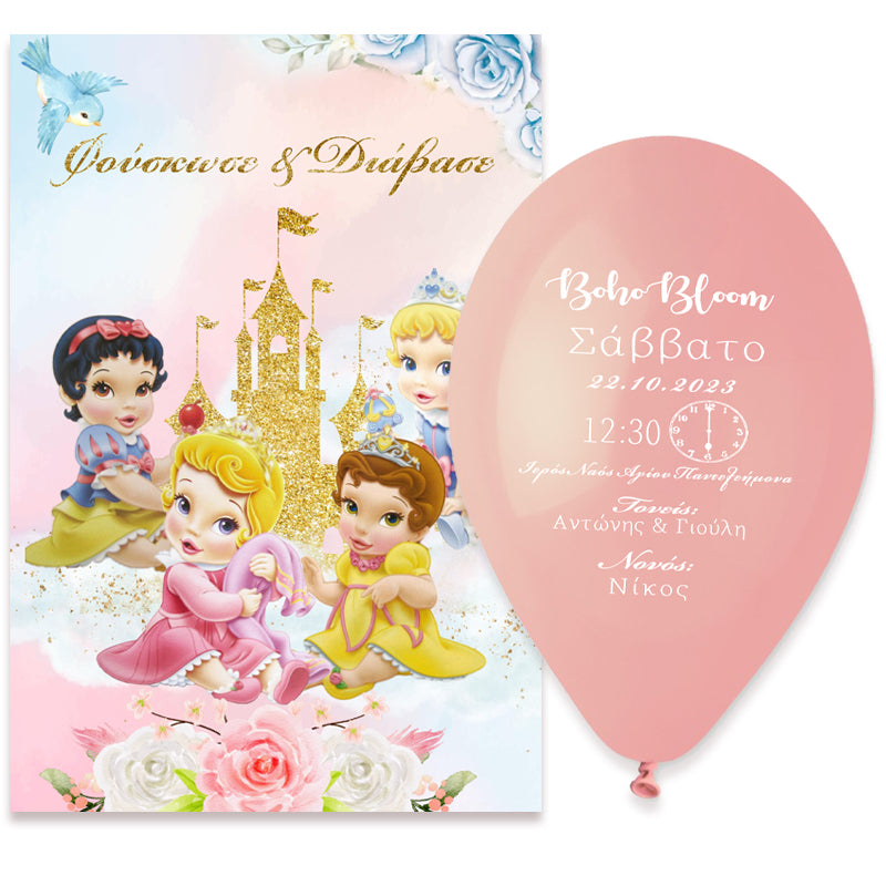 Πρωτότυπο προσκλητήριο βάπτισης σε τυπωμένο μπαλόνι με θέμα Baby Πριγκίπισσες Disney. Οι καλεσμένοι θα πρέπει να φουσκώσουν το τυπωμένο μπαλόνι για να μάθουν τις λεπτομέρειες της βάπτισης!