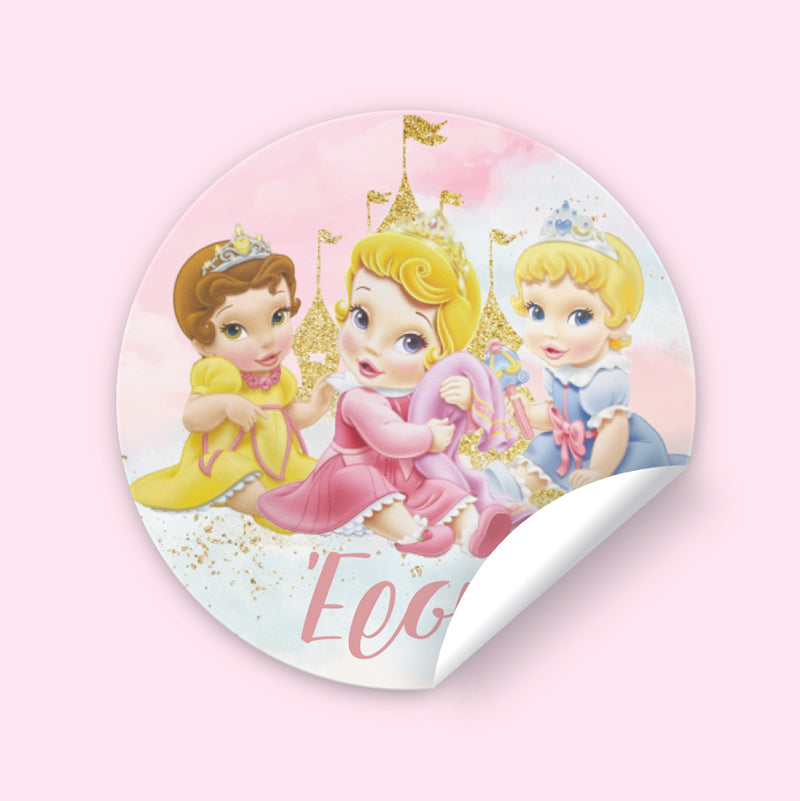 Στρογγυλά προσωποποιημένα αυτοκόλλητα με τις Πριγκίπισσες της Disney μωράκια. Μπορείτε να τα χρησιμοποιήσετε σε κουτάκια μπομπονιέρας, σε μπουκάλια και ποτήρια ή σε οποιοδήποτε άλλο αντικείμενο θέλετε να διακοσμήσετε για τη βάπτιση του μωρού σας.