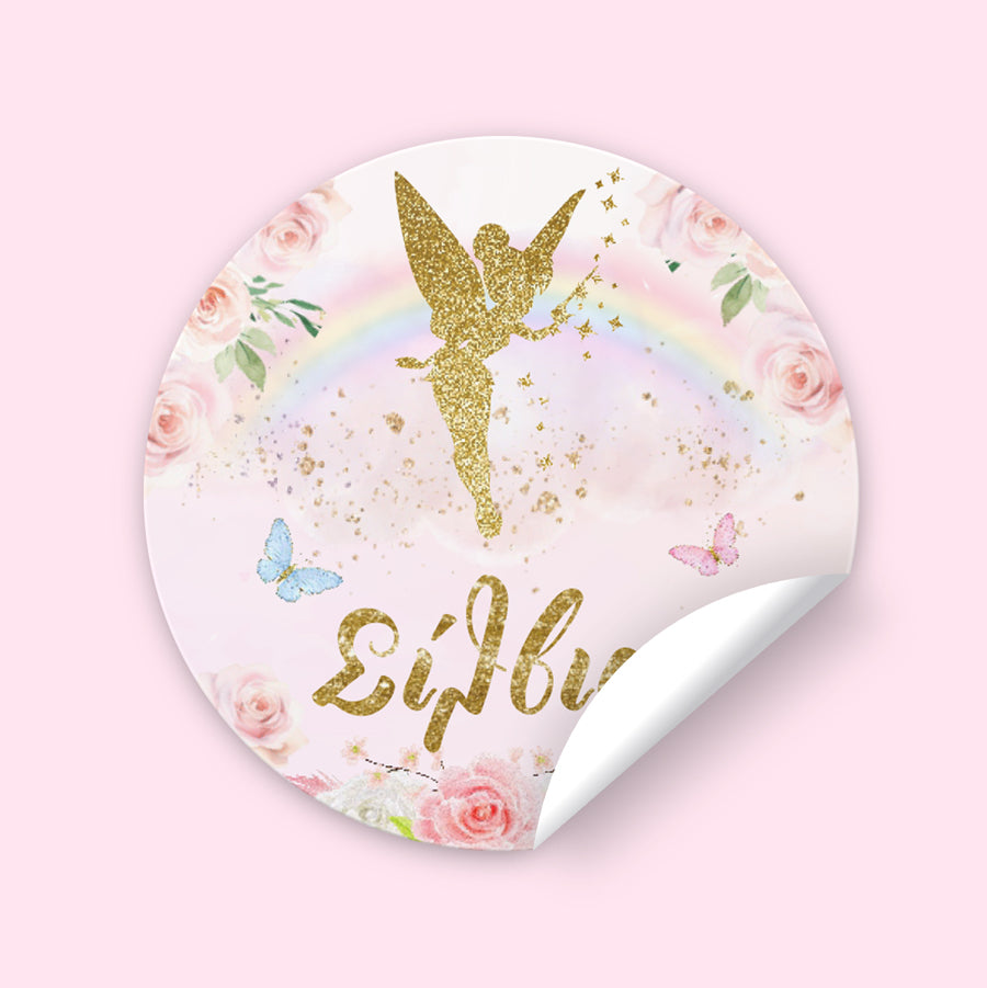 Στρογγυλά προσωποποιημένα αυτοκόλλητα χρυσή Νεραϊδούλα. Μπορείτε να τα χρησιμοποιήσετε σε κουτάκια μπομπονιέρας, σε μπουκάλια και ποτήρια ή σε οποιοδήποτε άλλο αντικείμενο θέλετε να διακοσμήσετε για τη βάπτιση του μωρού σας.