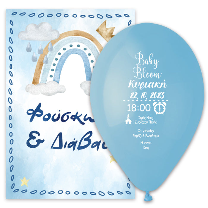 Πρωτότυπο προσκλητήριο βάπτισης σε τυπωμένο μπαλόνι με θέμα Ουράνιο Τόξο σε αγορίστικες αποχρώσεις. Οι καλεσμένοι θα πρέπει να φουσκώσουν το τυπωμένο μπαλόνι για να μάθουν τις λεπτομέρειες της βάπτισης!