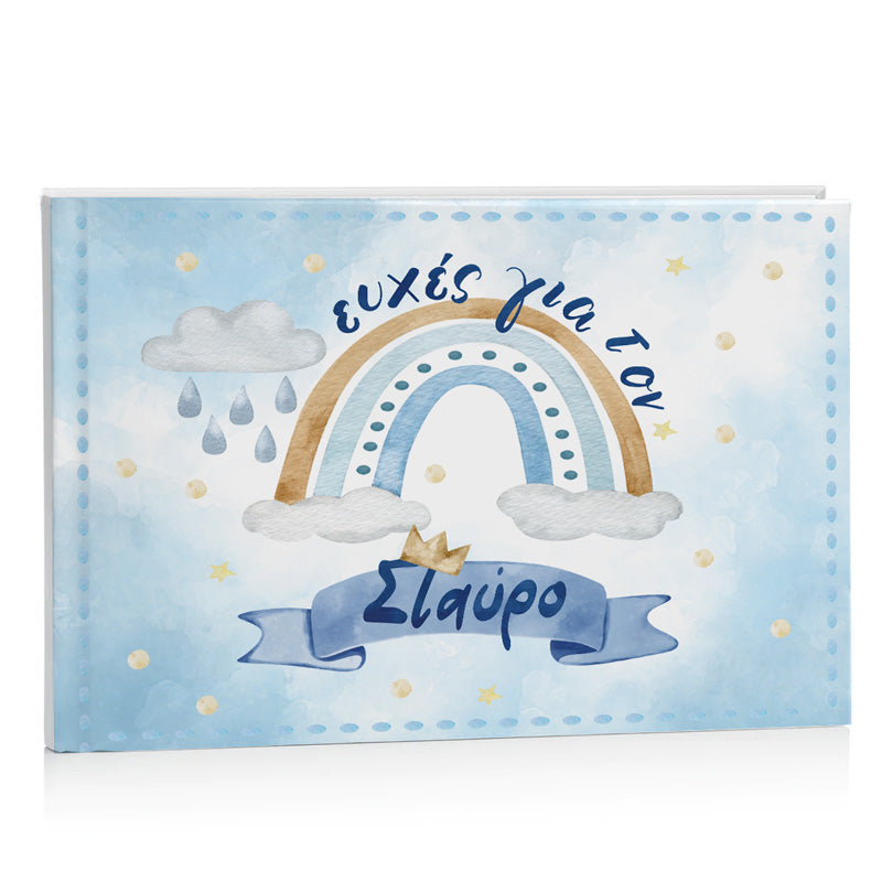 Εντυπωσιακό, χειροποίητο Βιβλίο Ευχών με θέμα το Ουράνιο Τόξο σε αγορίστικες αποχρώσεις για τη Βάπτιση του μωρού σας! Κρατήστε για πάντα τις ευχές των καλεσμένων σας σε ένα όμορφο ευχολόγιο.